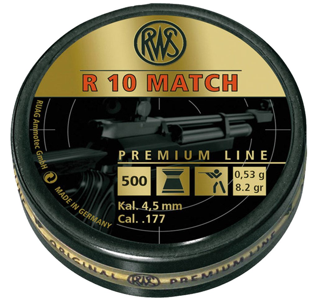 Marca: RWS Nombre del producto: Diábolo RWS R10 MATCH PREMIUM Cal. .177 Plano Cantidad: 500 Material: Plomo Calibre: 4.5″ (.177) Peso: 7.0 grains Cabeza: Plana