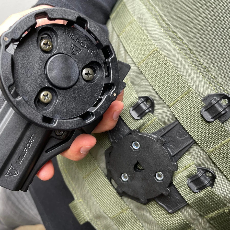 Consta de 3 piezas, 1 hembra y 2 machos; lo que permite ubicar la porta pistola en diferentes accesorios de su elección.